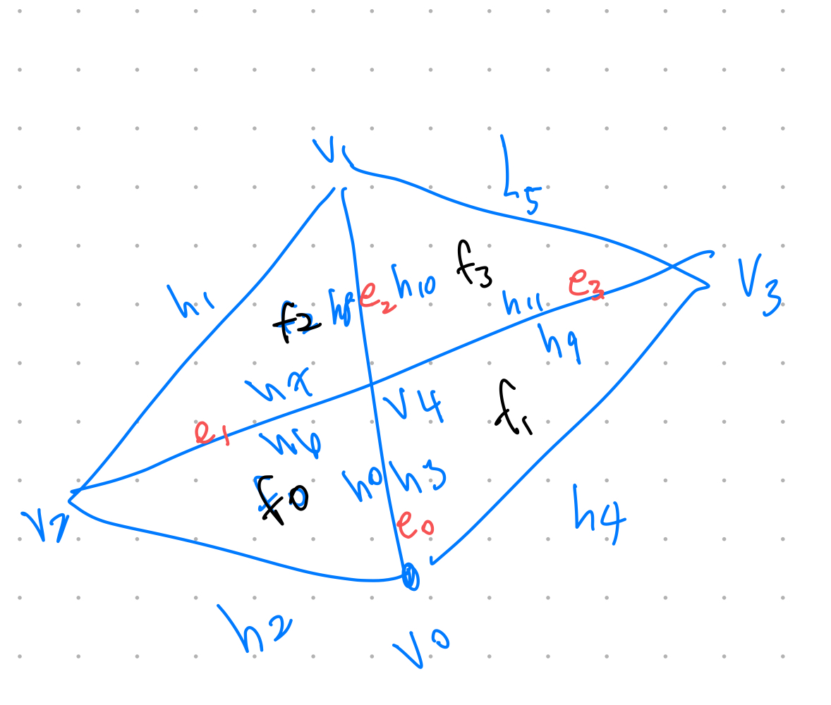 flipping. I then got all 6 halfedges, 4 vertices, and 2 faces associated with the two triangles and edge needed to be flipped.